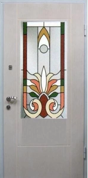 Входные двери в Кеме с применением декора витражом изготавливаются из стального профиля, придающего прочность конструкции, а сама витражная вставка обладает высокой взломостойкостью, поскольку для витражных композиций используется специальное стекло, обработанное особым образом. Усилить надежность витражного элемента можно с помощью использования декоративных кованных решеток.